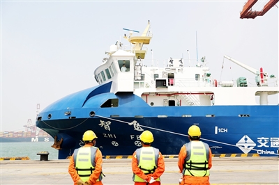 日前,我國自主研發的智能航行300TEU集裝箱商船“智飛”號在山東港口青島港首航。