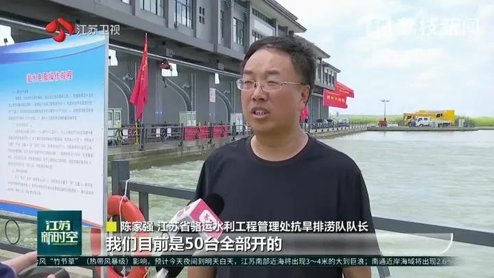 江蘇省駱運水利工程管理處抗旱排澇隊隊長陳家強說:“目前50臺全部打開,每臺0.25流量,總共12.5流量。一天大概翻110萬方水,從24日到現在共翻了255萬方水。”