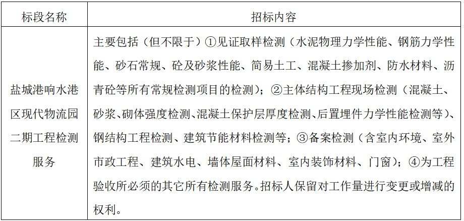 8、項目標段劃分:鹽城港響水港區現代物流園二期工程檢測服務共為1個標段,標段信息如下: