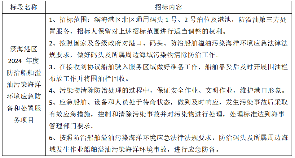 1、項目名稱:濱海港區(qū) 2024 年度防治船舶溢油污染海洋環(huán)境應急防備和處置服務項目