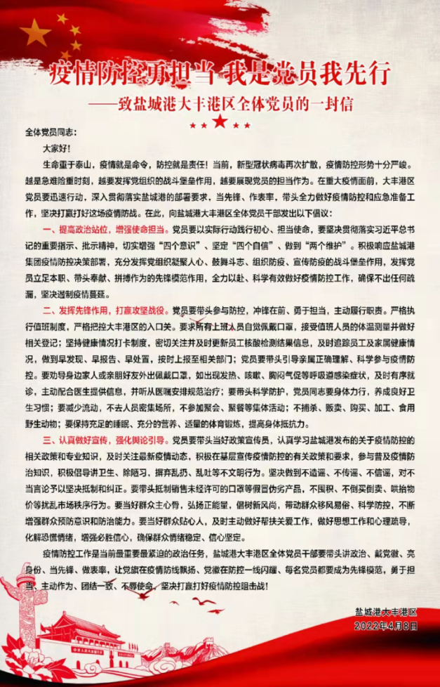 疫情就是命令,防控就是責(zé)任。面對來勢洶洶的疫情,集團(tuán)黨委下發(fā)了《關(guān)于在常態(tài)化疫情防控中充分發(fā)揮黨組織和黨員先鋒模范作用的通知》,接到命令后,鹽城港大豐港區(qū)堅(jiān)決將集團(tuán)疫情防控的決策部署落到實(shí)處,周密部署、快速行動(dòng),給各基層黨組織送去《致全體黨員的一封信》,倡導(dǎo)廣大黨員干部、職工群眾積極應(yīng)對、全員戰(zhàn)“疫”,各子(控)公司紛紛行動(dòng),使群防群控、聯(lián)防聯(lián)控的“一盤棋”全面落子布局,筑牢織密疫情防控防線。