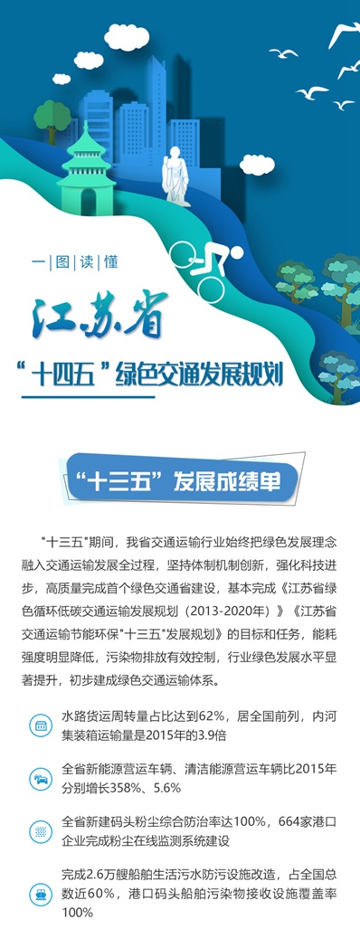 至“十四五”末,全面實現綠色能源消費占比、岸電使用率、鐵路和水路運輸周轉量占比、綠色出行比例“4提升”,營運貨車、營運貨船、港口生產碳排放強度和營運船舶氮氧化物排放總量“4下降”——近日,省交通運輸廳正式印發《江蘇省“十四五”綠色交通發展規劃》(以下簡稱《規劃》),明確提出“十四五”期間全省綠色交通發展按照“11478”的思路開展,實現“4升4降”,形成與資源環境承載力相匹配、與生產生活生態相協調的交通運輸發展新格局,有效支撐我省碳達峰碳中和目標如期實現。