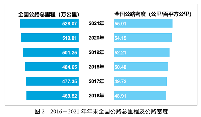 年末全國公路總里程528.07萬公里,比上年末增加8.26萬公里。公路密度55.01公里/百平方公里,增加0.86公里/百平方公里。公路養(yǎng)護(hù)里程525.16萬公里,占公路總里程比重為99.4%。