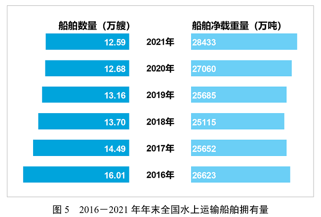 年末全國擁有水上運輸船舶12.59萬艘,比上年末下降0.7%,其中凈載重量28432.63萬噸、增長5.1%,載客量85.78萬客位、下降0.3%,集裝箱箱位288.43萬標(biāo)準(zhǔn)箱、下降1.6%。