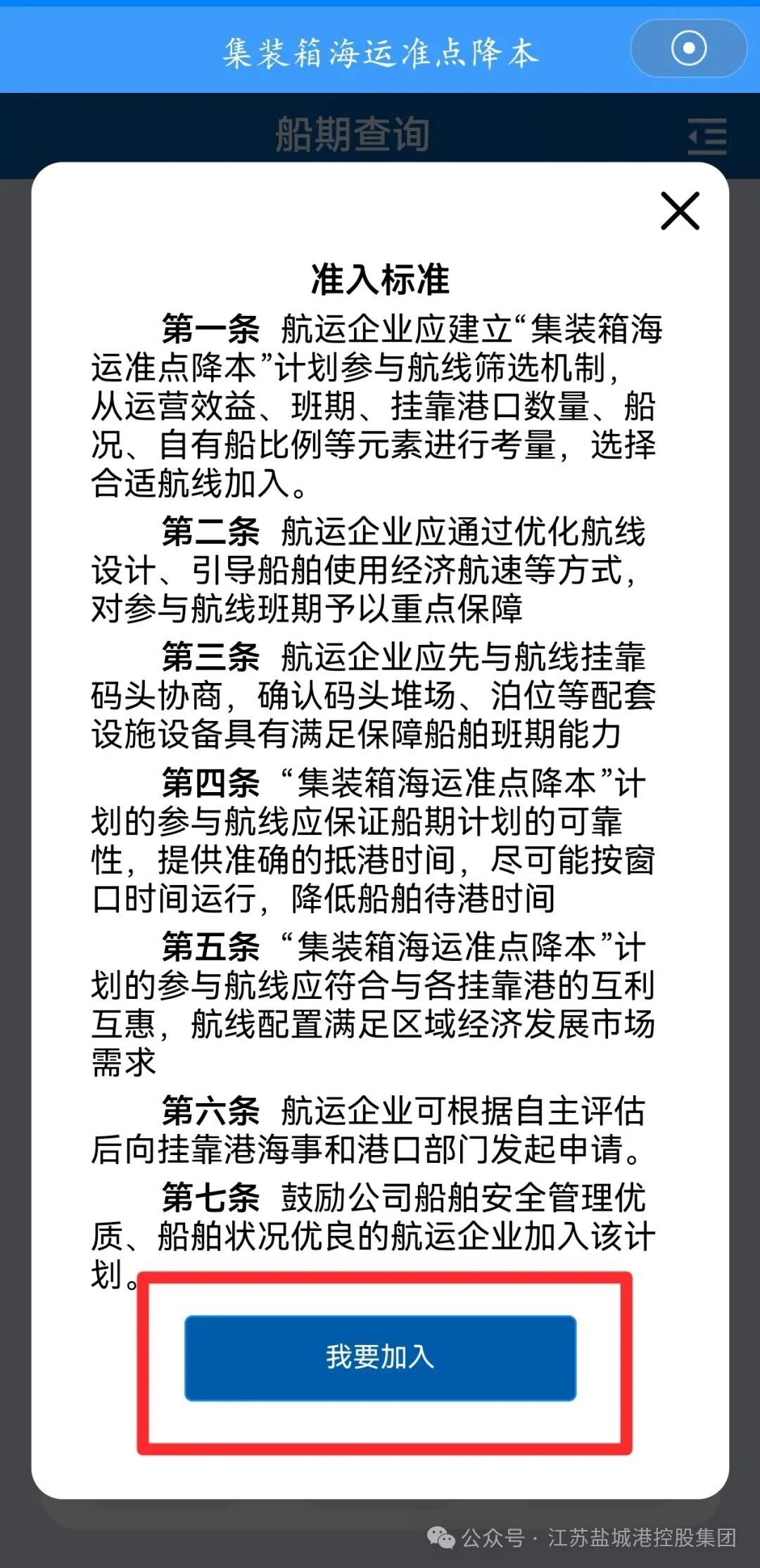 第三步:航運公司第一次登錄該模塊的用戶,系統默認顯示為船期查詢頁面,用戶點擊“申請加入”按鈕,選擇“我要加入”之后,輸入統一社會信用代碼、單位名稱、聯系電話、公司類型等相關信息,提交信息后,1-2個工作日之內,即可獲得完整的“準點降本”模塊使用權限。