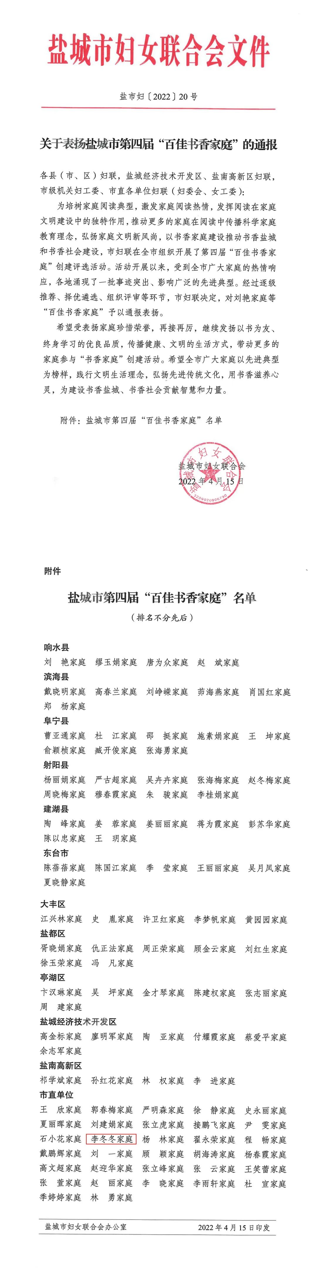 近日,從鹽城市婦女聯(lián)合會(huì)傳來(lái)好消息,在市第四屆“百佳書(shū)香家庭”評(píng)選活動(dòng)中,集團(tuán)下屬資產(chǎn)公司職工李冬冬家庭榮獲鹽城市“百佳書(shū)香家庭”稱號(hào)。