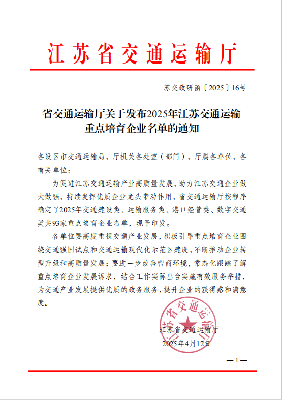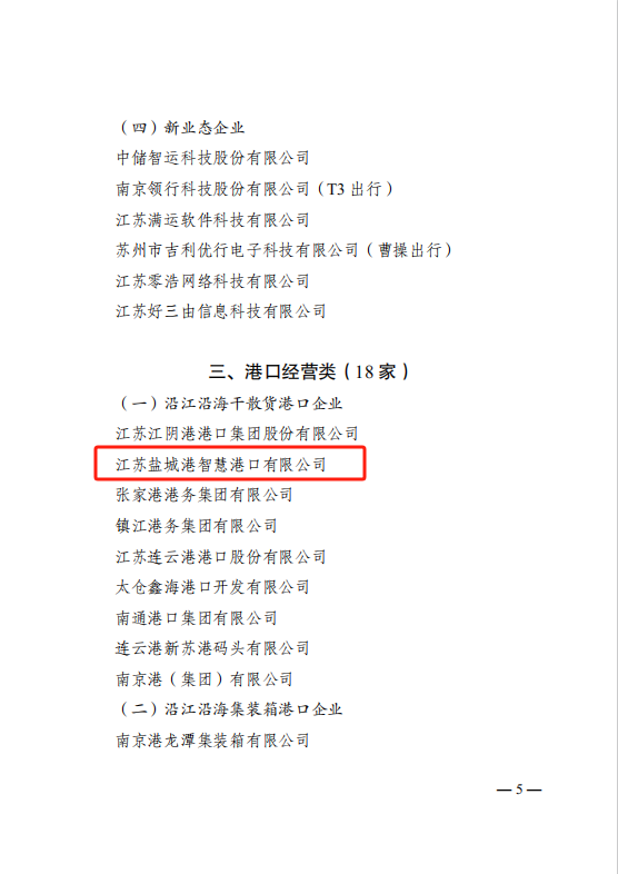 近日,江蘇省交通運(yùn)輸廳公布了“2025年江蘇交通運(yùn)輸重點(diǎn)培育企業(yè)”名單,鹽城港智慧港口公司入選,上榜港口經(jīng)營類沿江沿海干散貨港口企業(yè)。