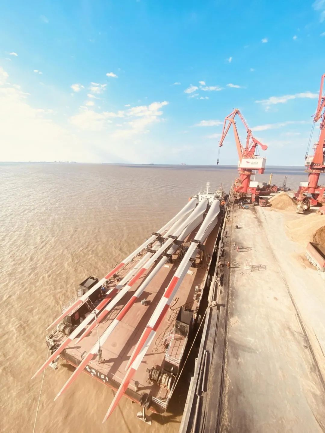11月28日上午,隨著最后2套90米風電葉片被緩緩吊起,平穩裝上遠瑞159輪,這意味著鹽城港大豐港區港口公司2021年金風科技海上風電項目裝船任務圓滿完成。本年度,港口公司合計完成金風科技海上風電項目風電葉片吊裝148套,735492立方,累計裝船94條。