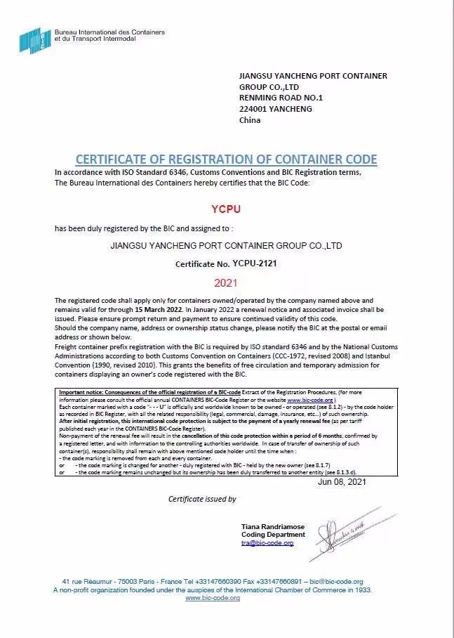 鹽城港集團集裝箱自備箱全部獲得國際集裝箱局(法國)登記認證,正式成為可以全球流通的集裝箱