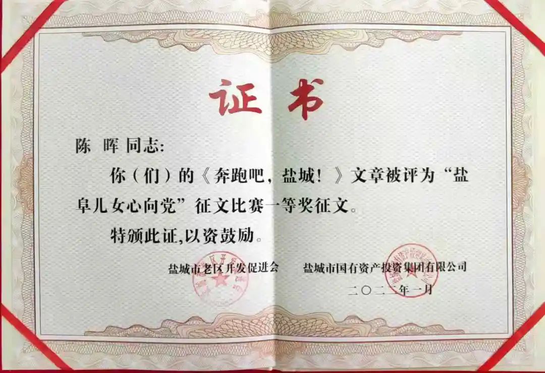 1月19日,由鹽城市老區(qū)開(kāi)發(fā)促進(jìn)會(huì)、鹽城市國(guó)有資產(chǎn)投資投資集團(tuán)有限公司主辦的“鹽阜兒女心向黨”征文評(píng)審表彰會(huì)議在鹽城隆重舉行,江蘇響水港港務(wù)有限公司財(cái)務(wù)部副經(jīng)理陳暉的《奔跑吧,鹽城!》作品在298篇文章中脫穎而出,榮獲一等獎(jiǎng)。