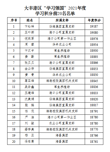 新的一年,為表彰先進、激勵后進,持之以恒地提高港區(qū)全體干部職工的學習自覺性和主動性,進一步加強學習型黨組織建設(shè)。近日,大豐港區(qū)舉行“學習強國”2021年度先進個人頒獎儀式,根據(jù)“學習強國”APP大豐港區(qū)年度學習積分排名,對成績突出的前20名“學習達人”代表進行了表彰,并頒發(fā)榮譽證書。