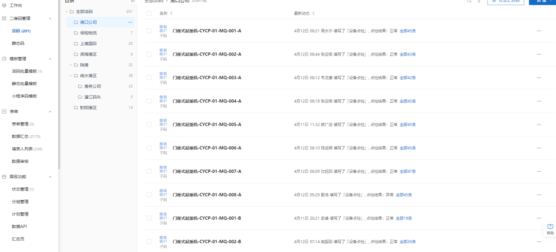 現(xiàn)場維護(hù)保養(yǎng)人員通過掃描港口設(shè)備上的二維碼,即可將設(shè)備維修、點(diǎn)檢和保養(yǎng)記錄錄入設(shè)備二維碼中,后臺數(shù)據(jù)實(shí)時(shí)更新,管理人員可隨時(shí)隨地查看全集團(tuán)港口設(shè)備的運(yùn)行情況,實(shí)現(xiàn)集團(tuán)集中掌握全部港口設(shè)備的運(yùn)行狀態(tài),提升了設(shè)備管理效率,對出現(xiàn)的問題能夠及時(shí)解決。同時(shí),利用大數(shù)據(jù)匯總分析設(shè)備的整體狀態(tài),可以對設(shè)備后期的采購、維護(hù)保養(yǎng)提供一定建議。