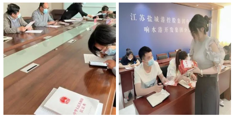 各子(控)公司積極響應集團部署,紛紛利用“學習強企·凝聚硬核”學習日,通過民法典學習手冊、民法典宣傳視頻、民法典讀書活動、律師講座、中國普法網答題活動等形式,組織員工集中學習,擴充知識儲備。大豐港區邀請律師就合同篇以案說法;港口公司送法進一線碼頭管理班組;文旅集團在酒店展播中國普法網《民法典伴你同行》《民法典新時代的圓規尺》等宣傳視頻實業集團深入社區,發放宣傳冊,重點宣傳高空拋物、飼養動物、建筑物區分所有權等法律知識,擔當普法惠民社會責任。