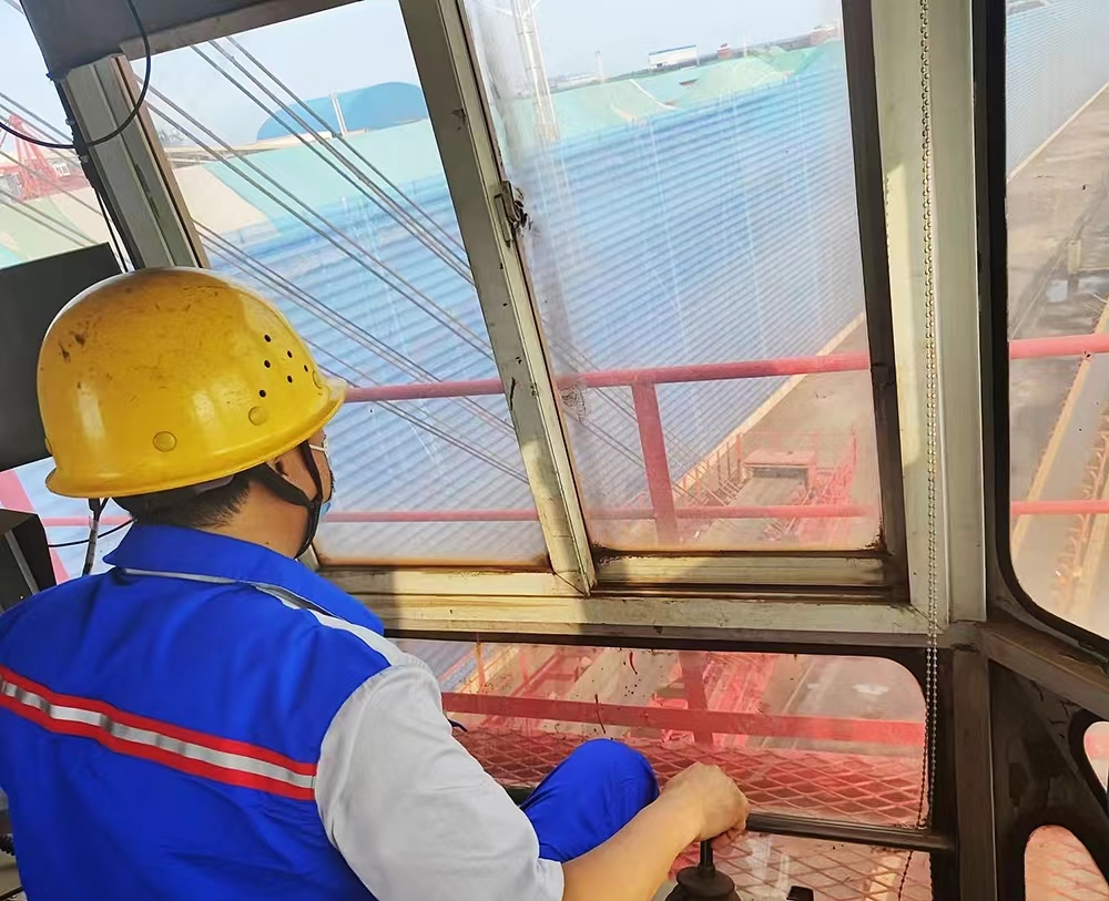 我的“座駕”是卸船機(jī)。我和搭檔勇挑重?fù)?dān),接卸遠(yuǎn)方來港的船舶,我們的任務(wù)是將貨物從船艙內(nèi)卸載至皮帶機(jī)上。在卸船作業(yè)中,我們熟練運(yùn)用掏艙作業(yè)、跑邊料等操作技巧,控制每個艙清倉時間2-3小時,不斷提升作業(yè)效率,縮短船舶滯留時間,服務(wù)廣大客戶。