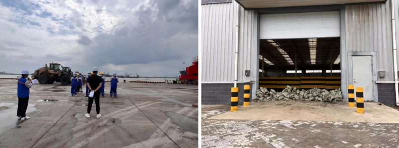 演練模擬安全環(huán)保部人員接到上級(jí)氣象災(zāi)害預(yù)警通知,我區(qū)域?qū)⒊霈F(xiàn)強(qiáng)降水、8級(jí)以上雷暴大風(fēng)極端天氣。接到通知后,相關(guān)部門(mén)立即停止室外作業(yè),緊急啟動(dòng)《防臺(tái)防汛應(yīng)急預(yù)案》。門(mén)機(jī)防風(fēng)演練現(xiàn)場(chǎng),應(yīng)急演練人員打開(kāi)隱藏式坑位蓋板,門(mén)機(jī)移機(jī)定位、下錨定插板、加固防風(fēng)拉索,快速完成單臺(tái)門(mén)機(jī)防風(fēng)加固任務(wù)。物流園防汛演練現(xiàn)場(chǎng),搶險(xiǎn)人員對(duì)室外堆場(chǎng)進(jìn)行針對(duì)性排水,并用沙袋將倉(cāng)庫(kù)、配電房等重點(diǎn)部位進(jìn)行封堵,迅速完成防洪墻堆建。