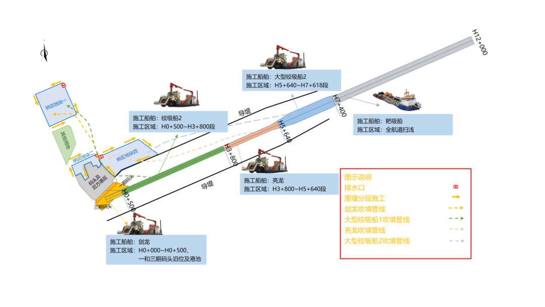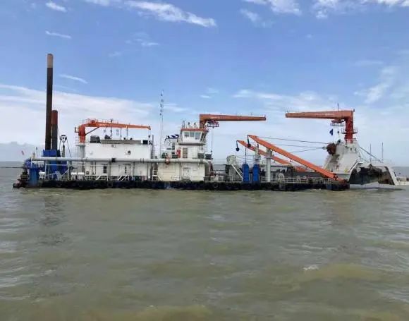 八月飄香季,奮斗正當(dāng)時(shí)。在3.5萬(wàn)噸航道上,機(jī)器轟鳴,“普交工1”號(hào)、“劍龍”號(hào)、“亮龍”號(hào)三“艦”合璧,將疏浚航道產(chǎn)生的疏浚土通過管線輸送到指定的納泥區(qū)。圍堰上,工人們鉚足干勁,土工布鋪設(shè)、袋裝土碼砌加緊施工……現(xiàn)場(chǎng)一片熱火朝天的建設(shè)景象。