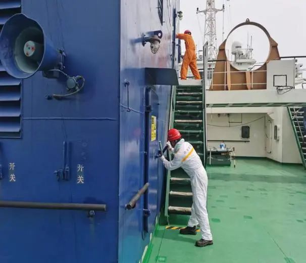 此次綜合應急演練活動分為消防演習和溢油演習兩個科目展開。首先進行的是消防演習,隨著演習總指揮的一聲令下,消防演習正式開始。隨著現場火災警報拉響,船長立即啟動消防應急程序并通過廣播通知船員失火部位,同時向灌河海事處匯報火災情況,灌河海事處隨即派遣正在灌河巡邏的“海巡06117”艇,靠前進行警戒指揮?!靶潞u帯贝瑔T通過采用便攜式滅火器,啟動船上固定二氧化碳滅火系統,成功撲滅明火。