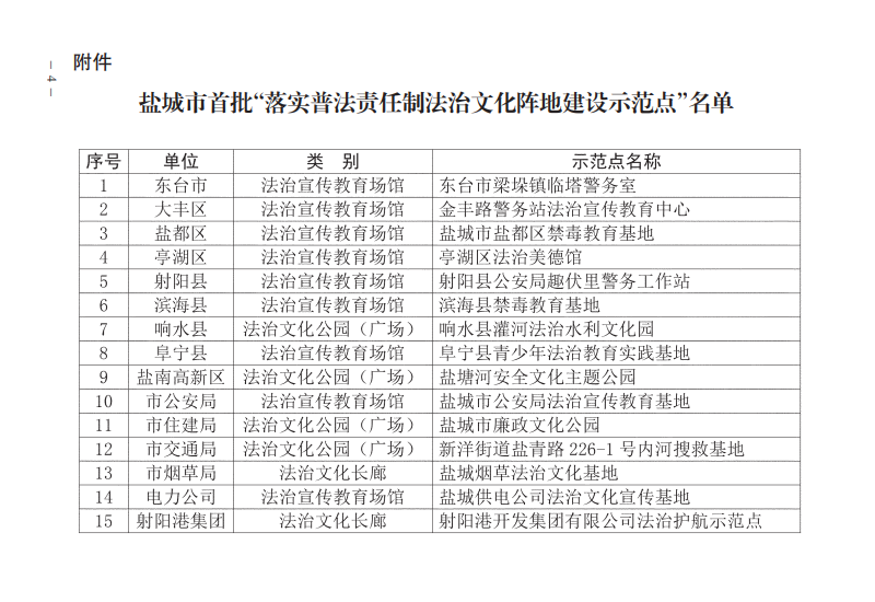 近期,由鹽城市委宣傳部、市委依法治市辦、市法宣辦、司法局4個部門單位發布關于公布鹽城市首批“落實普法責任制法治文化陣地建設示范點”的通知,江蘇鹽城港射陽港開發集團有限公司榮獲相關稱號。