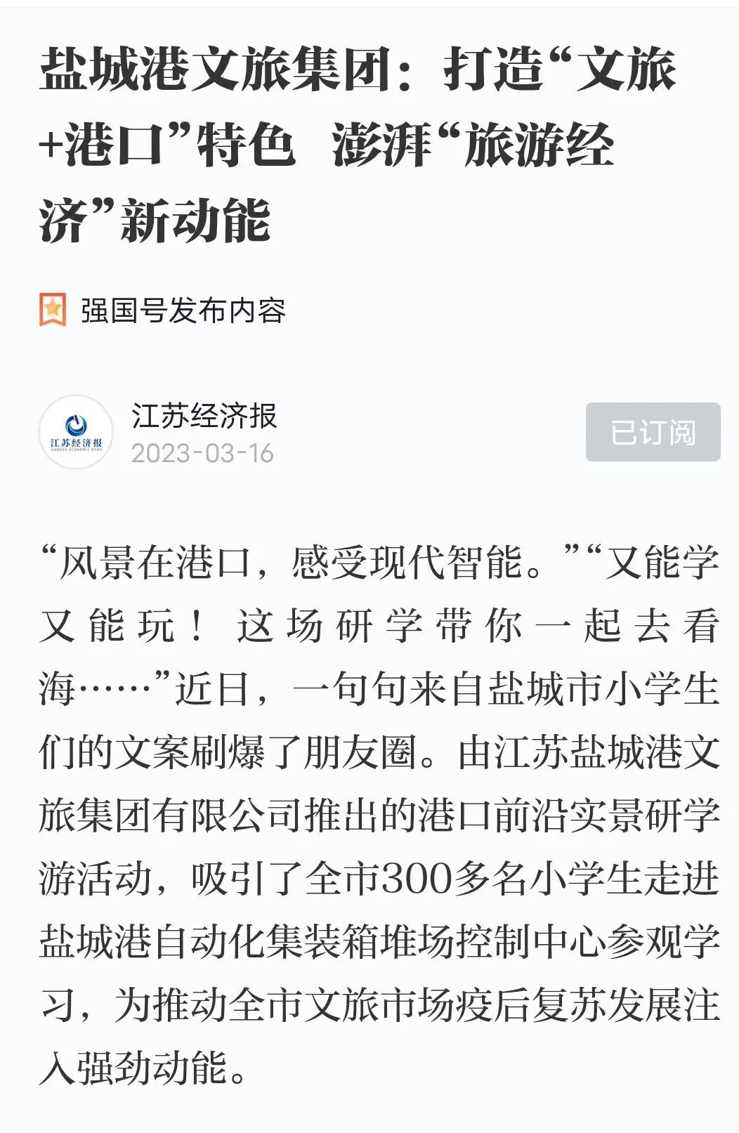 近日,江蘇經濟網、江蘇經濟報、學習強國等多家主流媒體平臺集體為鹽城港文旅集團點贊!以《鹽城港文旅集團:打造“文旅+港口”特色 澎湃“旅游經濟”新動能》為題對文旅集團在推動全市文旅市場疫后復蘇發(fā)展方面取得的成績進行了報道。