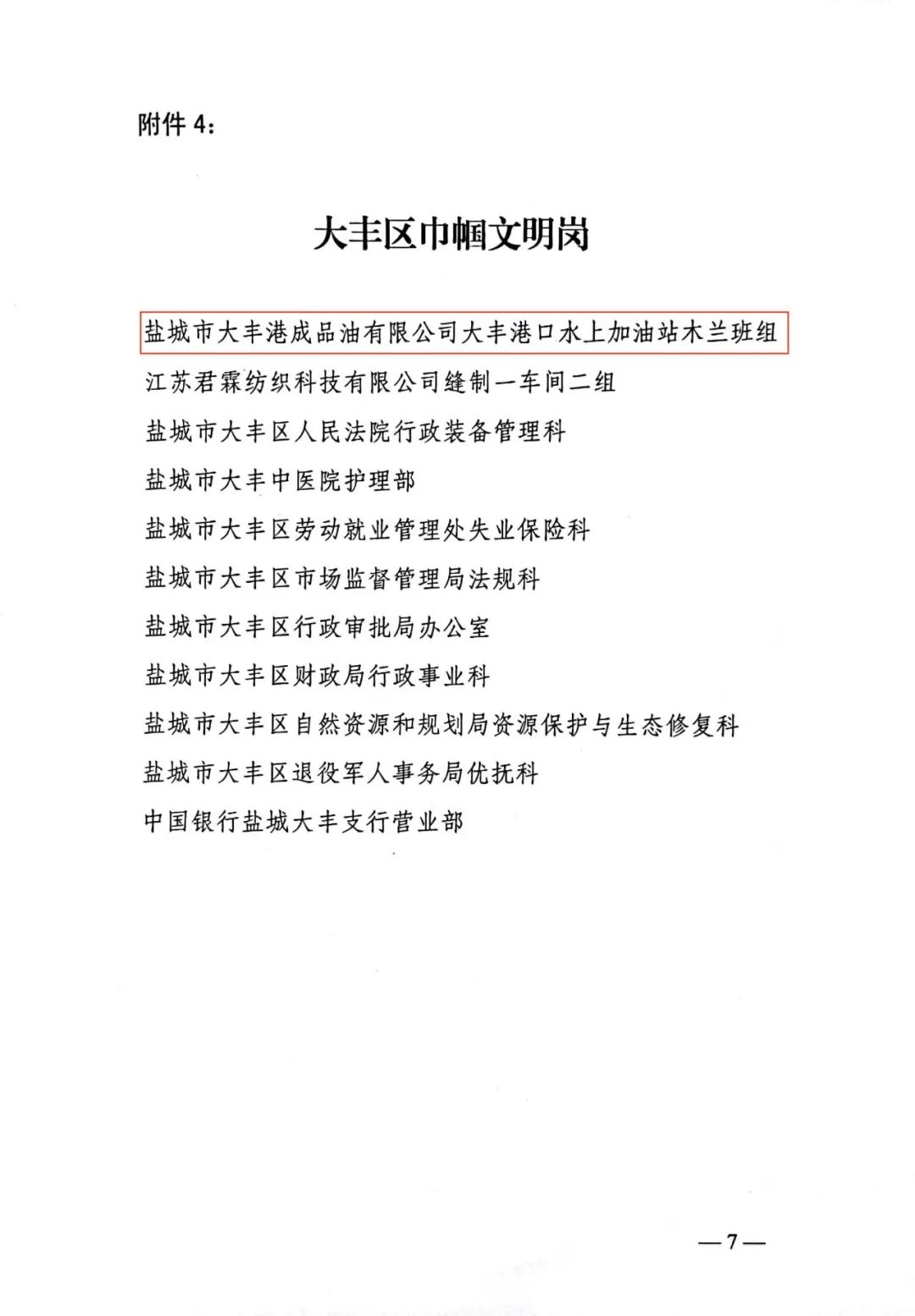近日,大豐區(qū)婦女聯(lián)合會發(fā)表《關(guān)于表揚2022年度大豐區(qū)三八紅旗手(集體)和大豐區(qū)巾幗建功標(biāo)兵、巾幗文明崗的通報》,鹽城港大豐港區(qū)成品油公司水上加油站“木蘭”班組榮獲“巾幗文明崗”榮譽稱號,班組成員王亞敏榮獲“三八紅旗手”榮譽稱號。