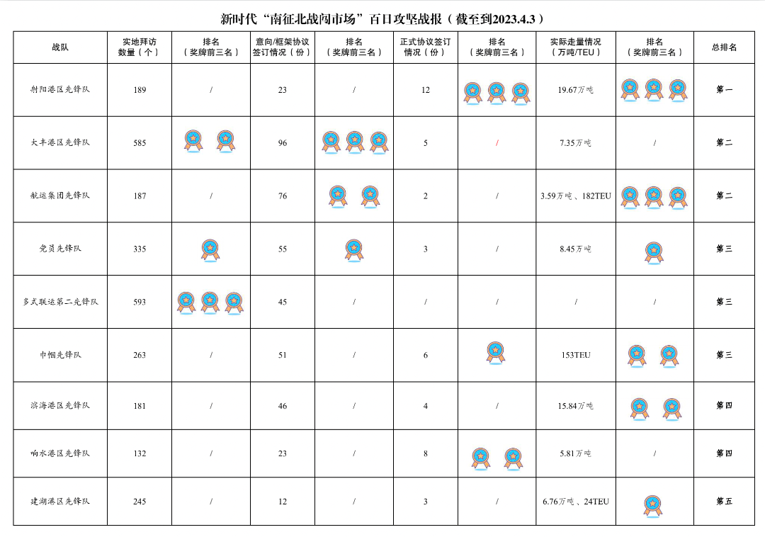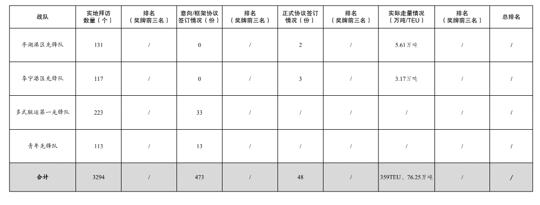 2.簽訂意向/框架協(xié)議數(shù)量473份:其中大豐港區(qū)先鋒隊96份,航運集團先鋒隊76份,黨員先鋒隊55份,巾幗先鋒隊51份,濱海港區(qū)先鋒隊46份,多式聯(lián)運第二先鋒隊45份,多式聯(lián)運第一先鋒隊33份,射陽港區(qū)先鋒隊23份,響水港區(qū)先鋒隊23份,青年先鋒隊13份,建湖港區(qū)先鋒隊12份。