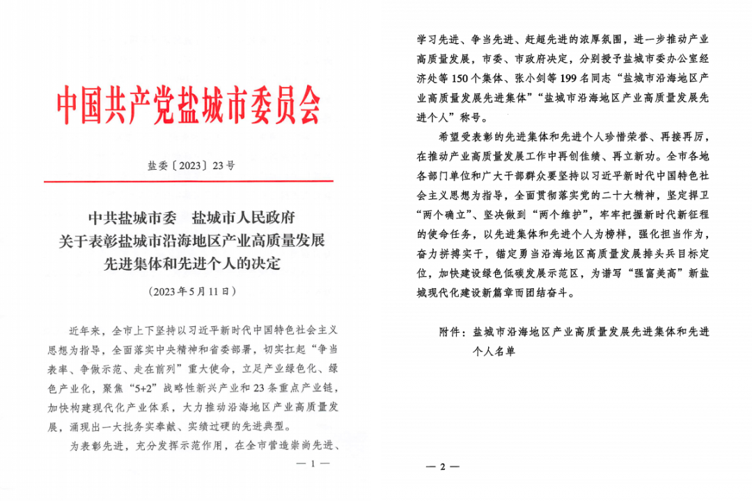 近日,市委、市政府發布關于表彰鹽城市沿海地區產業高質量發展先進集體和先進個人的決定,集團獲“鹽城市沿海地區產業高質量發展先進集體”榮譽稱號。