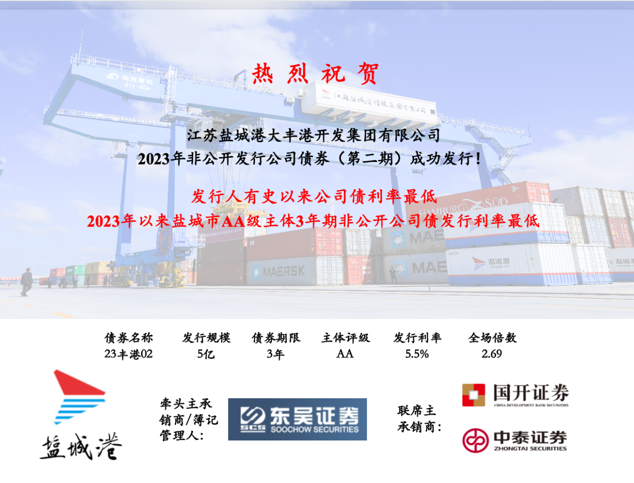 6月14日,在鹽城港集團成立三周年之際,大豐港開發集團2023年面向專業投資者非公開發行公司債券(私募公司債券第二期)簿記成功。本期債券發行規模5億元,期限3年,票面利率5.5%,全場認購倍數2.69倍,創下大豐港開發集團私募公司債券利率歷史最低紀錄。