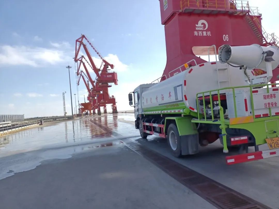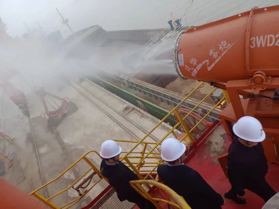 在碼頭散貨裝卸過(guò)程中實(shí)施全程水霧抑塵與作業(yè)噴淋管理;散貨堆場(chǎng)堆碼嚴(yán)格做到全面、及時(shí)苫蓋;明確運(yùn)輸車輛封閉性、貨物苫蓋、裝貨高度以及車輪沖洗等規(guī)定;港區(qū)內(nèi)道路全天保證完整濕式清掃4次以上,白天實(shí)行不間斷灑水。確保在“生產(chǎn)性”揚(yáng)塵形成初期,編織起一張“立體防護(hù)網(wǎng)”。