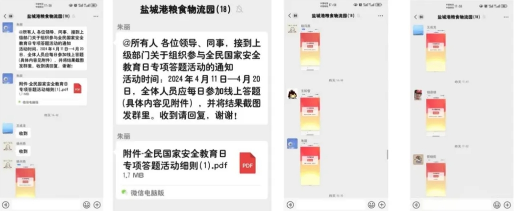 線上利用公司微信群、黨員學(xué)習(xí)微信群發(fā)送學(xué)習(xí)資料,全方位、多角度宣傳國家安全知識,進一步增強“國家安全無小事”的觀念和意識。