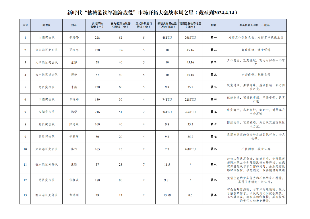 1.累計拜訪客戶數(shù)量4921家:其中大豐港區(qū)突擊隊935家,響水港區(qū)突擊隊392家,巾幗突擊隊382家,射陽港區(qū)突擊隊377家,阜寧港區(qū)突擊隊362家,多式聯(lián)運(yùn)第一突擊隊352家,航運(yùn)集團(tuán)突擊隊339家,亭湖港區(qū)突擊隊329家,青年突擊隊324家,多式聯(lián)運(yùn)第二突擊隊307家,黨員突擊隊287家,建湖港區(qū)突擊隊276家,濱海港區(qū)突擊隊259家。