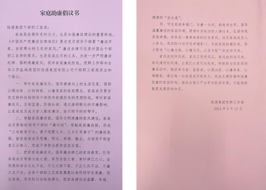 家庭齊心助廉。“為進一步嚴明廉潔紀律、筑牢家庭廉政防線,黨群工作部向全體陸港集團干部職工家庭發出如下倡議……”在警示教育大會上,陸港集團黨群工作部向全體干部職工發出了《家庭助廉倡議書》,引導干部職工家屬常吹“家庭廉潔風”,做好“家庭廉內助”,把好“家庭廉潔門”,以清廉家風抵御腐敗歪風,齊心協力,共同織密“家庭護廉網”。