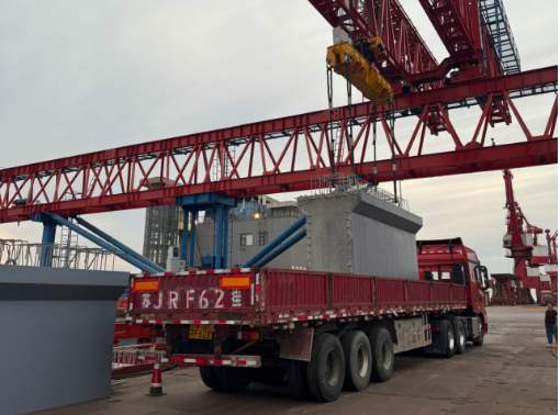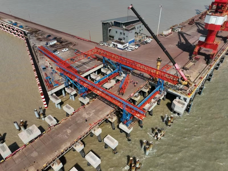 研發(fā)和升級新型碼頭施工裝備——一體化智能提梁機(jī),通過橫移與縱移機(jī)構(gòu)實現(xiàn)天車在橫縱梁范圍內(nèi)的全方位行走,從而進(jìn)行吊梁作業(yè)。與傳統(tǒng)浮吊相比,每榀梁安裝時間從2小時縮減至15分鐘,把“水上施工”轉(zhuǎn)換到“陸地施工”,消除了海浪對施工造成的影響,有效提升施工質(zhì)量。