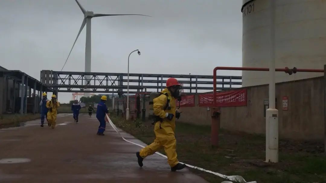 在模擬罐組一泵房法蘭墊破裂發生汽油泄漏引起火災的消防演練中,各小組配合默契、反應迅速、銜接有序、措施果斷,現場忙而不亂,參演人員對指揮人員下達的每一個指令都能夠在第一時間給予回應并立即執行,確保緊急情況下第一時間搶險救援。各小組結合現場情況分析應對初起火災的應急處置流程、周邊消防設備設施的正確使用要領、火災撲救消防安全知識等,同時確保每名職工都能牢牢掌握會報警、會撲救、會疏散的必備消防技能。真正做到掌握消防應急技能,練就過硬本領。