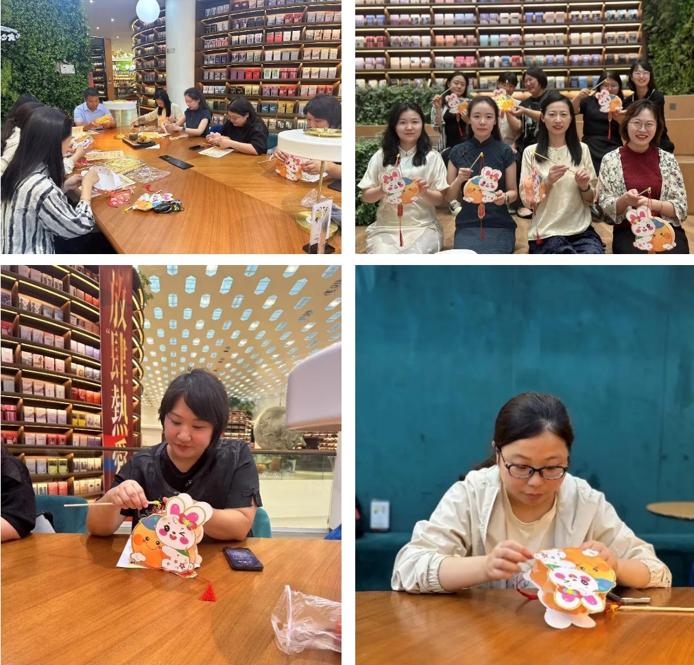 系上流蘇繩,穿上燈帶,扣入玉兔,大家認真制作著屬于自己的花燈,一個個俏皮可愛的古風燈籠就制作成型了。制作玉兔花燈環節讓組員們親自動手體驗了文化遺產的魅力,不僅展示了組員們的創造力,也體現了對傳統文化的傳承與尊重。燈籠制作完成后,所有參與人員在花燈的映照下合影留念,留下了這個溫馨時刻的美好記憶。