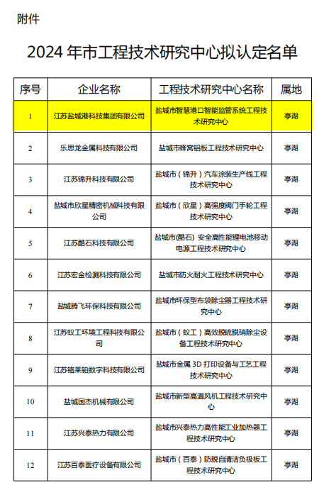近日,鹽城市科學技術局發布了《關于2024年鹽城市工程技術研究中心認定名單》,其中科技集團成功入選,被認定為“鹽城市智慧港口智能監管系統工程技術研究中心”。這一榮譽標志著科技集團在智慧創新領域上又邁出了堅實的步伐。