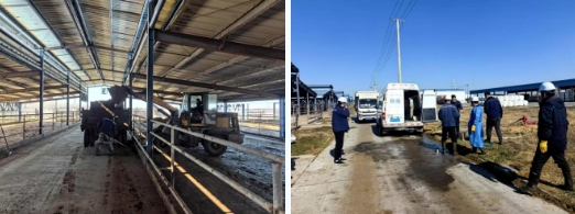 棚舍內(nèi),裝載機(jī)往來穿梭,轟鳴聲不斷。工作人員加班加點(diǎn)清理牛糞并運(yùn)往糞污處理區(qū),對(duì)牛棚進(jìn)行全面清掃。身著防護(hù)服的消毒人員,手持專業(yè)消殺設(shè)備,對(duì)場(chǎng)地、棚舍、通道以及各類設(shè)備進(jìn)行全方位消毒,為種牛營(yíng)造一個(gè)安全、衛(wèi)生的環(huán)境。
