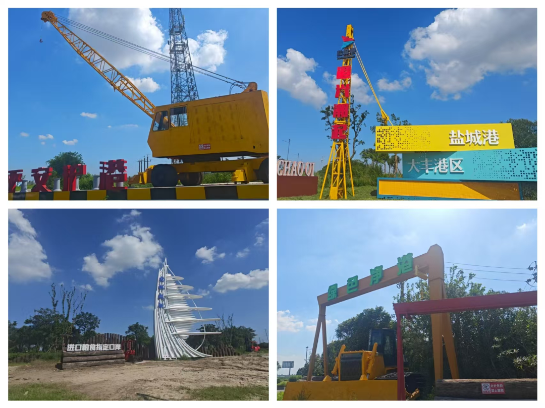轉角處,一臺閑置輪胎式起重機穩穩“站”在特制的碼頭造型基座上。它那剛勁的鋼鐵骨架,高高托舉著象征物流單元的集裝箱雕塑,瞬間將人拉回吊臂揮舞、貨柜起落的繁忙碼頭現場。這個場景暗藏雙重密碼:穩固的姿態是“平安發展”的無聲誓言,而“吞吐量齊頭并進”的蓬勃造型,則大聲宣告著“港興潮起通天下”的開放雄心!