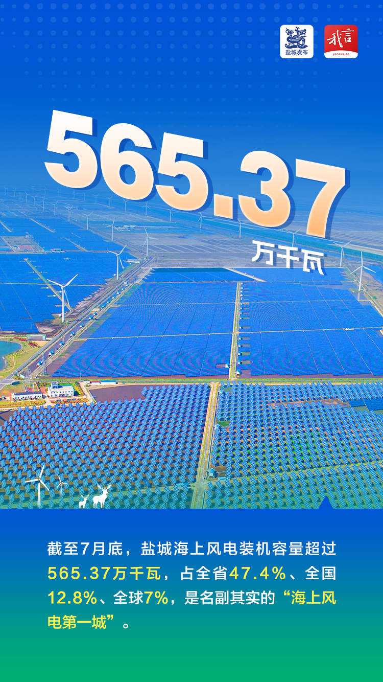 鹽城集聚國家能源、華電、國電投、華能、大唐、華潤等“五大六小”所有新能源開發央企。截至7月底,鹽城海上風電裝機容量超過565.37萬千瓦,占全省47.4%、全國12.8%、全球7%,是名副其實的“海上風電第一城”。