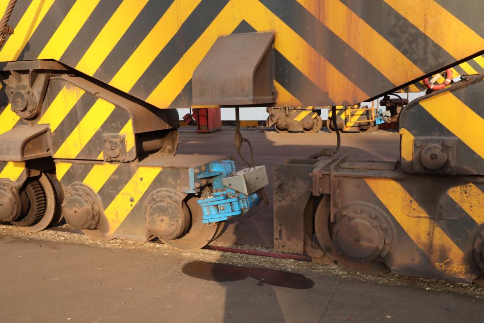 該裝置工作原理類似于汽車的“剎車盤”。當(dāng)強(qiáng)風(fēng)吹動(dòng)門機(jī)滑移20至30公分時(shí),系統(tǒng)內(nèi)置的自動(dòng)編碼器會(huì)即時(shí)感應(yīng)并觸發(fā)夾輪器,將行走輪牢牢鎖死在軌道上,形成剛性制動(dòng)。這套系統(tǒng)響應(yīng)迅速、制動(dòng)可靠,從根本上提升了大型機(jī)械在惡劣天氣下的抗風(fēng)能力與作業(yè)穩(wěn)定性。