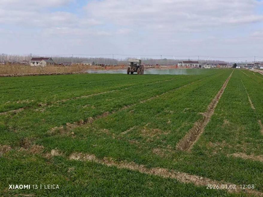 針對當前二麥、油白菜長勢不均衡的突出問題,金色農業堅持“人防為先、精準施策”,組織農技人員分片包聯、下沉田間,逐地塊排查苗情、墑情,因地制宜制定差異化管護方案,扎實推進抗旱補肥、促弱轉壯等關鍵技術措施落地見效。對仍處于“土里捂”狀態、未出苗或出苗不齊,且表墑偏旱的田塊,搶抓日間氣溫回升的適宜時機,組織人工配合機械開展噴灌、溝灌洇水作業,勻速補水、適度增墑,全力促進作物出苗齊、長勢勻;對3葉以下、表墑偏旱的麥田、菜田,在精準灌溉的基礎上,同步補施尿素或葉面噴施補氮制劑,快速補充養分、緩解旱情,助力弱苗提勢;對4-6葉期、群體偏大的田塊,精準開展化控調控,搭配噴施磷鉀肥,有效抑制無效分蘗、促進健壯生長,為在田作物平衡長勢、安全越冬筑牢堅實基礎。