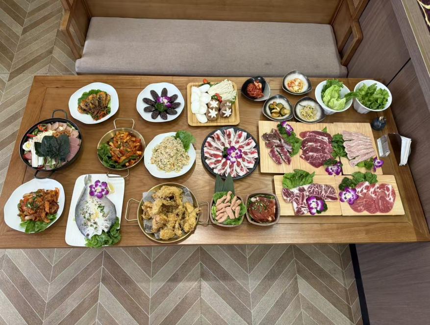 598元套餐(多人):牛五花、雪花牛板腱、LA 牛排、部隊火鍋、整只炸雞等韓式經典,搭配南瓜湯、水果茶、生菜無限續,聚餐氛圍熱烈。