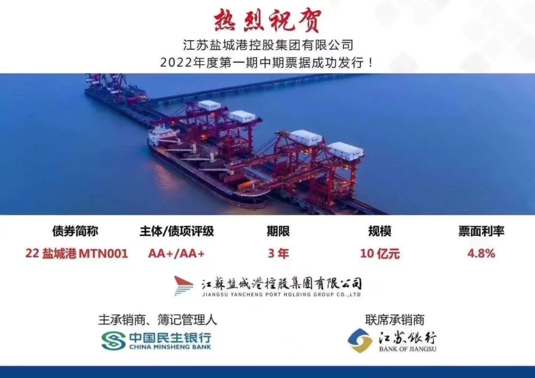 9月21日,鹽城港集團(tuán)2022年度第一期中期票據(jù)成功發(fā)行,金額10億元,票面利率4.8%,進(jìn)一步提振了資本市場對鹽城港集團(tuán)發(fā)展的信心。
