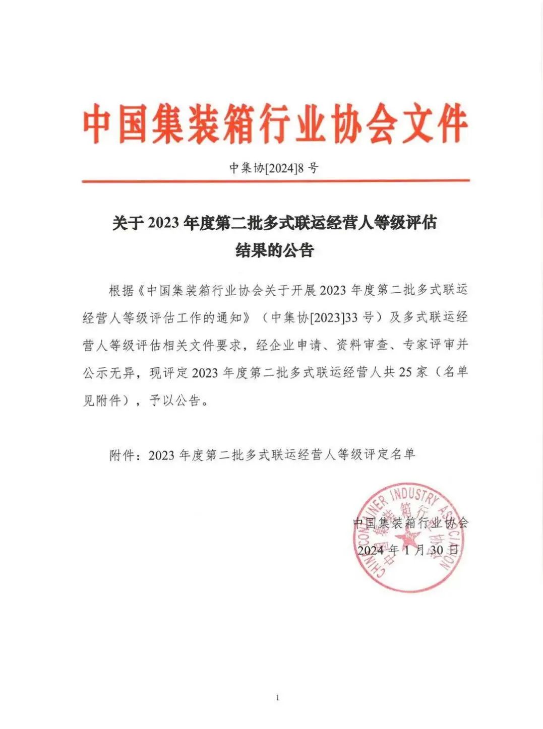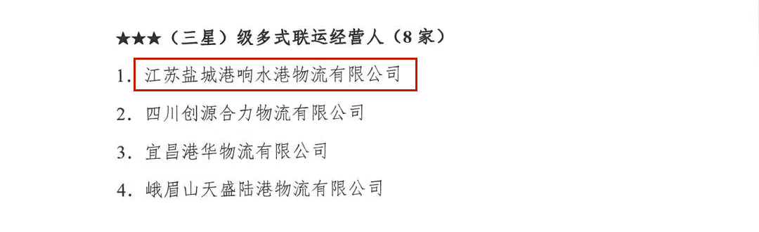 近日,中國(guó)集裝箱行業(yè)協(xié)會(huì)發(fā)布2023年度第二批多式聯(lián)運(yùn)經(jīng)營(yíng)人等級(jí)評(píng)定名單,江蘇鹽城港響水港物流有限公司獲得“三星級(jí)多式聯(lián)運(yùn)經(jīng)營(yíng)人”稱號(hào)。