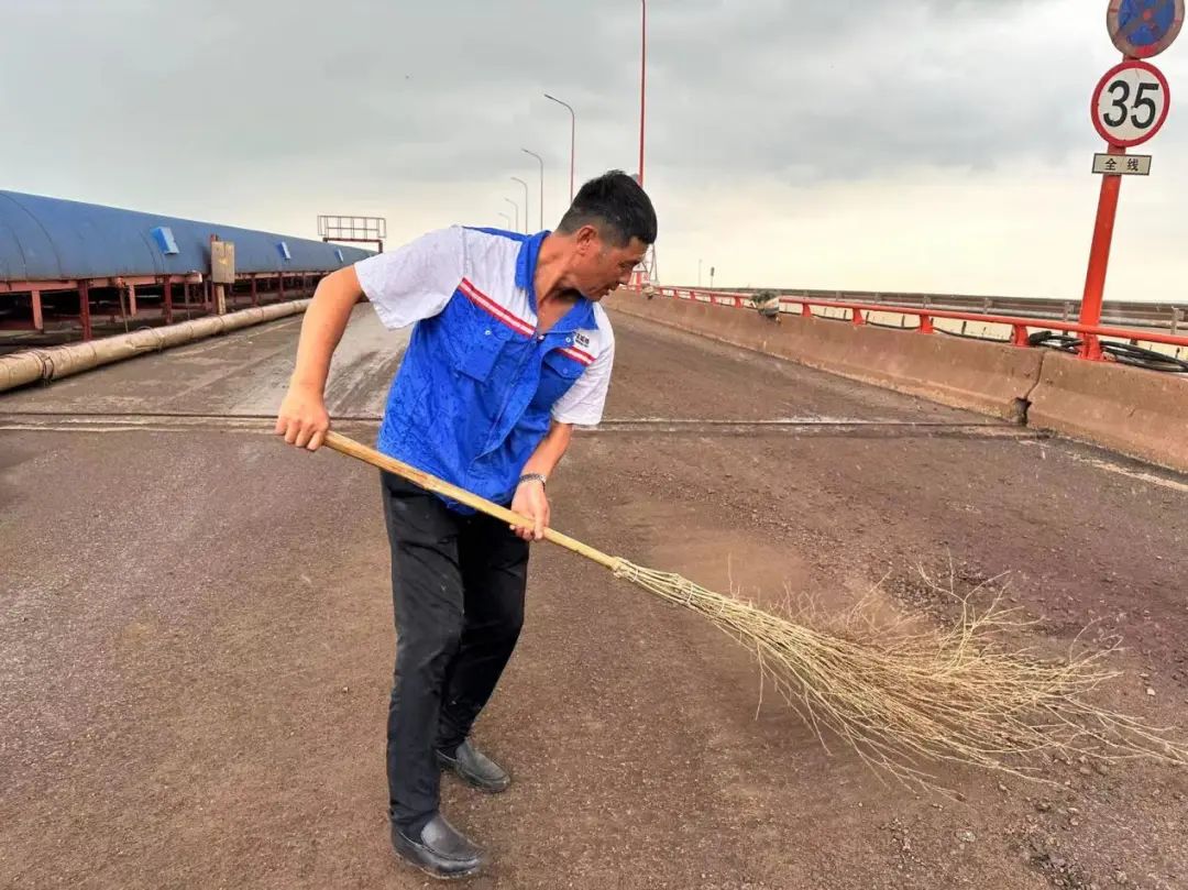 在糧食碼頭引橋,散落的貨物殘?jiān)S處可見,清掃隊(duì)員們迅速行動(dòng),認(rèn)真細(xì)致地進(jìn)行清理,確保做到不漏項(xiàng)、不脫節(jié)、無(wú)死角、無(wú)盲區(qū)。