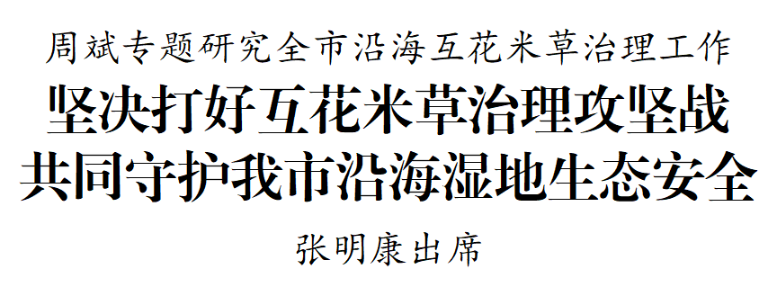 5月23日下午,市委書記周斌專題研究全市沿?;セ撞葜卫砉ぷ?。他強調,要深入貫徹習近平總書記關于互花米草防治的重要批示精神,認真落實國家和省相關部署要求,堅持把互花米草治理作為促進人與自然和諧共生的重大政治任務,深入開展專項行動,堅決守護好沿海生物多樣性和濕地生態系統安全。市委副書記、代市長張明康出席。
