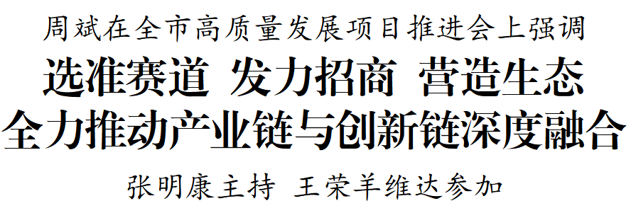 5月24日至25日,全市高質(zhì)量發(fā)展項(xiàng)目推進(jìn)會(huì)召開。市委書記周斌出席并講話。他強(qiáng)調(diào),要深入學(xué)習(xí)貫徹習(xí)近平新時(shí)代中國特色社會(huì)主義思想,全面落實(shí)“四個(gè)走在前”重大任務(wù),加快推動(dòng)產(chǎn)業(yè)鏈與創(chuàng)新鏈深度融合,以科技創(chuàng)新支撐引領(lǐng)經(jīng)濟(jì)高質(zhì)量發(fā)展,努力推動(dòng)經(jīng)濟(jì)運(yùn)行率先整體好轉(zhuǎn),為競逐新賽道、勇當(dāng)排頭兵注入強(qiáng)大動(dòng)能。市委副書記、代市長張明康主持會(huì)議,市人大常委會(huì)主任王榮,市委副書記、統(tǒng)戰(zhàn)部部長羊維達(dá)參加。