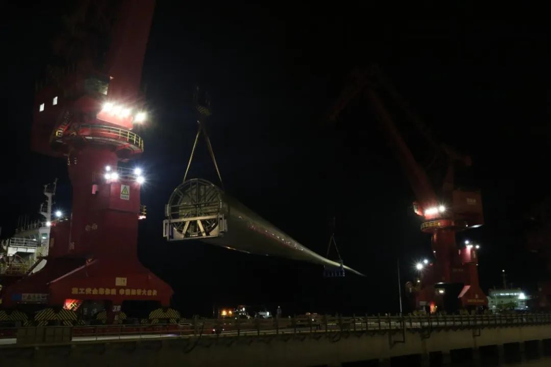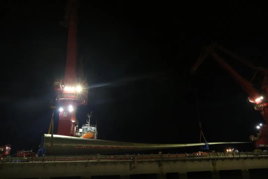 “指揮就位”“車輛就位”“裝卸就位”“安全員就位”......9月30日晚,在一系列作業準備就緒后,全球最長風電葉片在鹽城港射陽港區風電碼頭成功完成裝卸,再度刷新鹽城港裝卸風電葉片長度新紀錄,向黨的二十大獻上了一份厚禮。