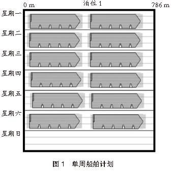 2.3 船舶泊位參數(shù)根據(jù)港口提供的實際船舶和泊位規(guī)格參數(shù),建立船舶精確模型和簡化模型,具體模型按照現(xiàn)場作業(yè)需求和仿真系統(tǒng)實際運行情況進行選擇。為了對港口堆場作業(yè)進行有效的仿真分析,在設置泊位參數(shù)時,優(yōu)先考慮實際作業(yè)過程中最大泊位通過能力。按照單周作業(yè)計劃進行工況設定,單周計劃作業(yè)船舶12艘,單艘船舶裝箱量為420~ 530 TEU,卸箱量為420~530 TEU。單周船舶計劃見圖1。