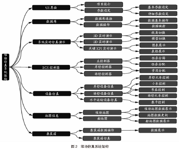3仿真模型搭建3.1 堆場仿真系統(tǒng)架構根據(jù)港口堆場作業(yè)特點和堆場系統(tǒng)功能,設計搭建港口堆場仿真系統(tǒng)架構。該架構主要包括UI界面、數(shù)據(jù)庫、系統(tǒng)實時仿真演示、ECS控制器、設備仿真、地圖信息、集裝箱等部分,主要用于實現(xiàn)數(shù)據(jù)交互、模型設計、任務調度管理、仿真測試、結果演示等功能。堆場仿真系統(tǒng)架構見圖2。
