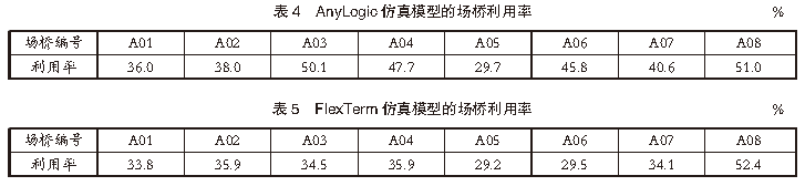 4仿真結果分析利用港口自動化堆場相關數(shù)據(jù),分別對基于AnyLogic軟件和FlexTerm軟件的堆場系統(tǒng)仿真模型的仿真結果進行對比分析。4.1 場橋利用率對比在集裝箱堆場作業(yè)中,場橋是提高堆場作業(yè)效率的關鍵因素。合理分析場橋利用率對提高堆場作業(yè)效率、減少船舶在港停泊時間尤為重要。根據(jù)港口提供的堆場作業(yè)參數(shù)和實際堆場作業(yè)的場橋利用情況,對堆場內場橋使用情況進行仿真對比分析。AnyLogic仿真模型的場橋利用率見表4,F(xiàn)lexTerm仿真模型的場橋利用率見表5,2種仿真模型的場橋利用率對比見表6。